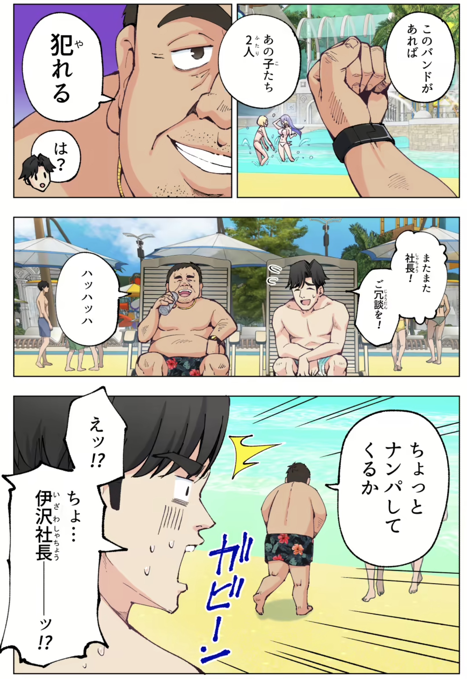 社長と二人きりのレジャーに連れてこられた主人公は、特別な「黒バンド」を付ける事に。何と「黒バンド」は女の子と好きなだけセックスができる夢のアイテム!